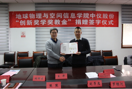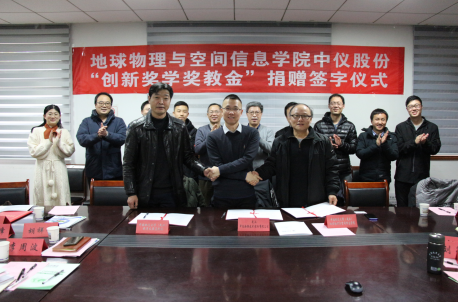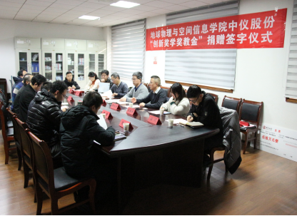 (通讯员 张川 )1月14日下午,地空学院中仪股份“创新奖学奖教金”捐赠仪式在物探楼214会议室举行。武汉中仪物联技术股份有限公司董事长郑洪标、总经理助理张婉珈,副校长王华,学校教育发展基金会副秘书长吕占峰,地空学院党委书记刘子忠、院长熊熊、副书记李周波、副院长罗银河、胡祥云教授及学院教师代表、学校教育发展基金会工作人员等出席。仪式由学院党委副书记李周波主持。