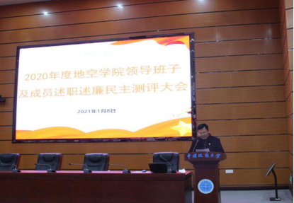 2021年1月8日下午15:30,地空学院在东区教学综合楼A0113召开2020年度学院领导班子及成员述职述廉民主测评大会,党委常委、副校长刘勇胜、组织部副部长梁本哲及全院教职工参加会议。大会由学院党委书记刘子忠主持。