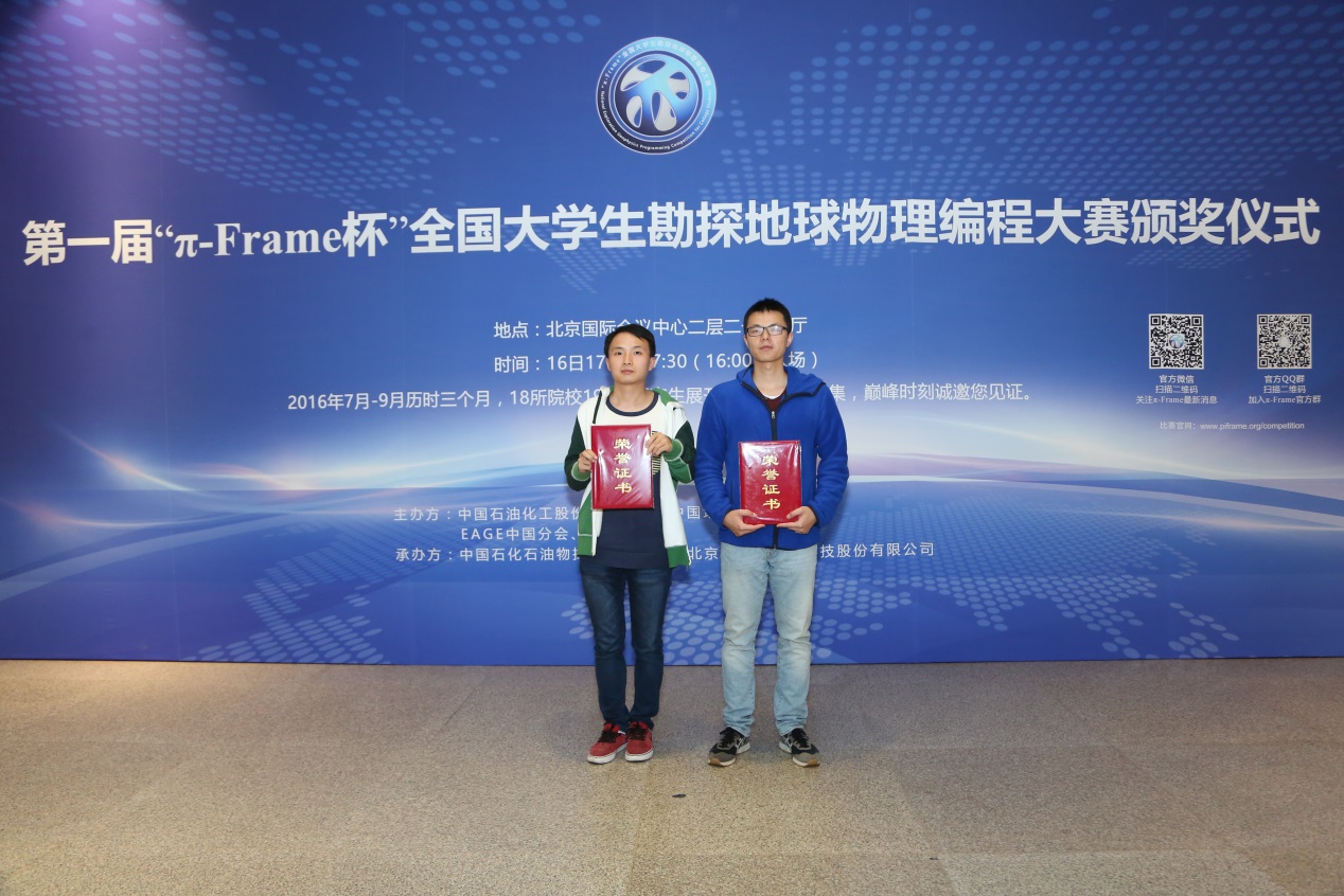 (通讯员 顾汉明、马凯)10月16日,由中国石化联合中国地球物理学会、SEG中国和EAGE中国分部举办的第一届“π-Frame杯”全国大学生勘探地球物理编程大赛决赛在北京国际会议中心圆满落幕。我院研究生“Glee”团队(队长蔡志成,队员李屹、马凯)荣获二等奖,“Forever”团队(队长周寒,队员智龙霄、杨永龙)荣获三等奖,我校荣获优秀组织奖。