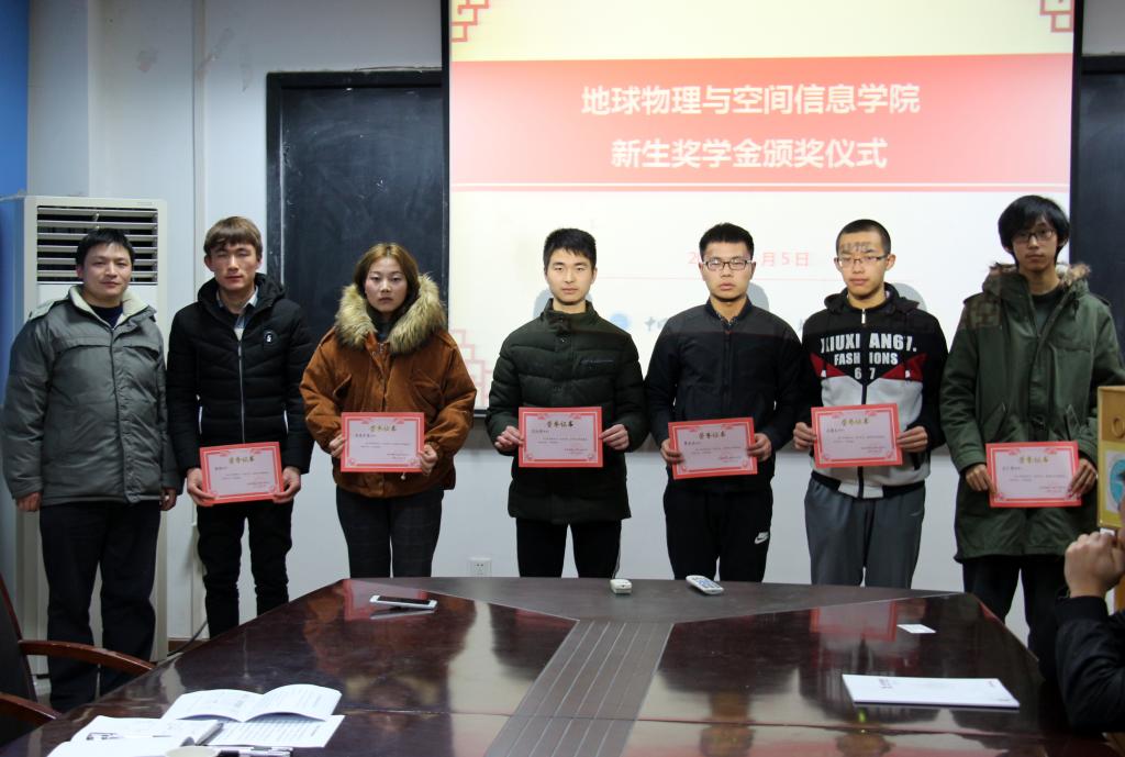 (通讯员张川 摄影祁阳阳)2018年1月5日下午,地空学院在物探楼214召开2017级新生入学奖学金颁奖仪式。武汉中仪物联技术股份有限公司董事长郑洪标、学院党委副书记李周波,辅导员张川、祁阳阳,2017级各班班长、团支书以及10名获奖新生参会。
