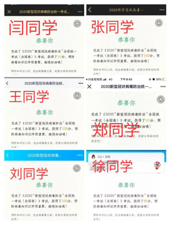 分享结束后,在团支书的组织下全体同学积极参加了《2020新型冠状病毒防治统一考卷》线上答题,并晒出了自己的成绩。通过答题同学们进一步加深了对新冠肺炎的了解与预防措施。答题结果显示,有50%的同学全部正确,其余同学大部分做错一道或者两道。从结果来看,所有同学对新型肺炎疫情时刻关注,大家展示出了在疫情防控期间奋进担当、蓬勃向上的新时代精神风貌。