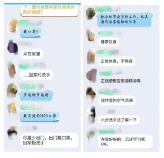 在学习完以上内容之后,周丹同学邀请此时身在武汉的一些同学们与大家分享“疫情下的武汉”。分享的同学们提到,自武汉封城到现在,虽然交通不便,物资也并不充足,但是通过这次疫情,他们深深体会到了中国人民齐心协力共同抗疫的团结精神,各方纷纷支援武汉,送来了食品和口罩等必备物品,成为武汉强有力的后盾。