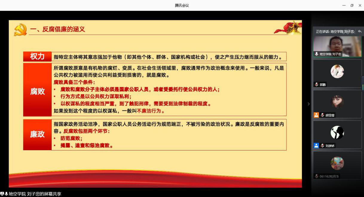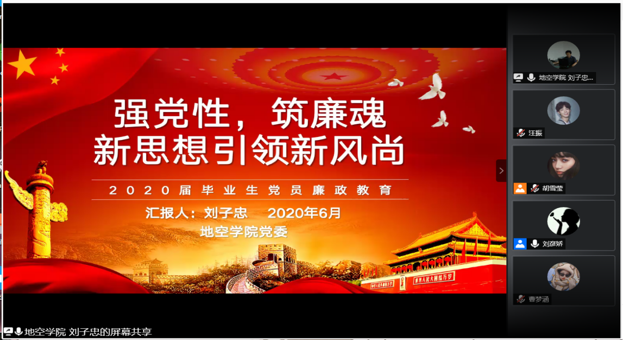 (通讯员刘彦娇 汪振)在2020届毕业生即将离校之际, 为深入学习贯彻习近平新时代中国特色社会主义思想和党的十九大精神,贯彻落实全国高校思想政治工作会议精神,紧紧围绕立德树人根本任务,积极培育和践行社会主义核心价值观,进一步引导毕业生廉洁修身,走好迈向社会的第一步,地空学院党委于6月24日晚19:30通过腾讯会议平台组织学院全体毕业生党员进行党员廉政教育。课程由学院党委书记刘子忠主讲,辅导员刘彦娇主持。