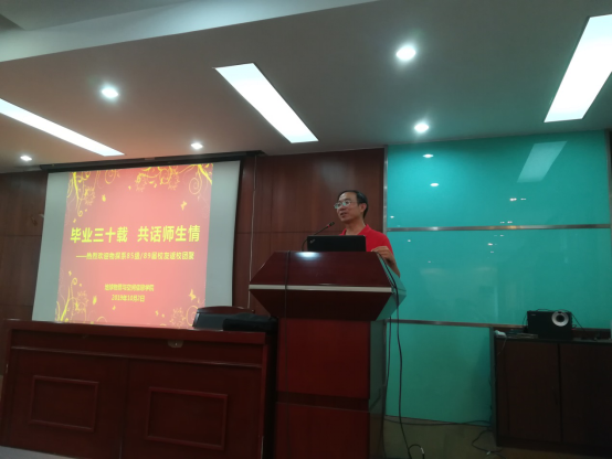 毕业生代表和老教师代表先后发言。毕业学生代表张宗胜站在台上,重新以一个学生谦逊的态度为自己昔日恩师讲述自己30年来的经历,或成就斐然,或略显平凡,但都受到了老师们的一致肯定。老教师潘玉玲表达了注重健康、廉洁奉公、守护家庭、珍惜时光、继续奋进等美好期盼,年近耄耋却依旧心怀国家,心系学子,让人动容。85级原辅导员、现任自动化学院党委书记董浩斌发言。他回顾了当年与学生打成一片的种种往事,感叹岁月之蹉跎,同时也表达了始终不变的物探人情怀让人敬重。