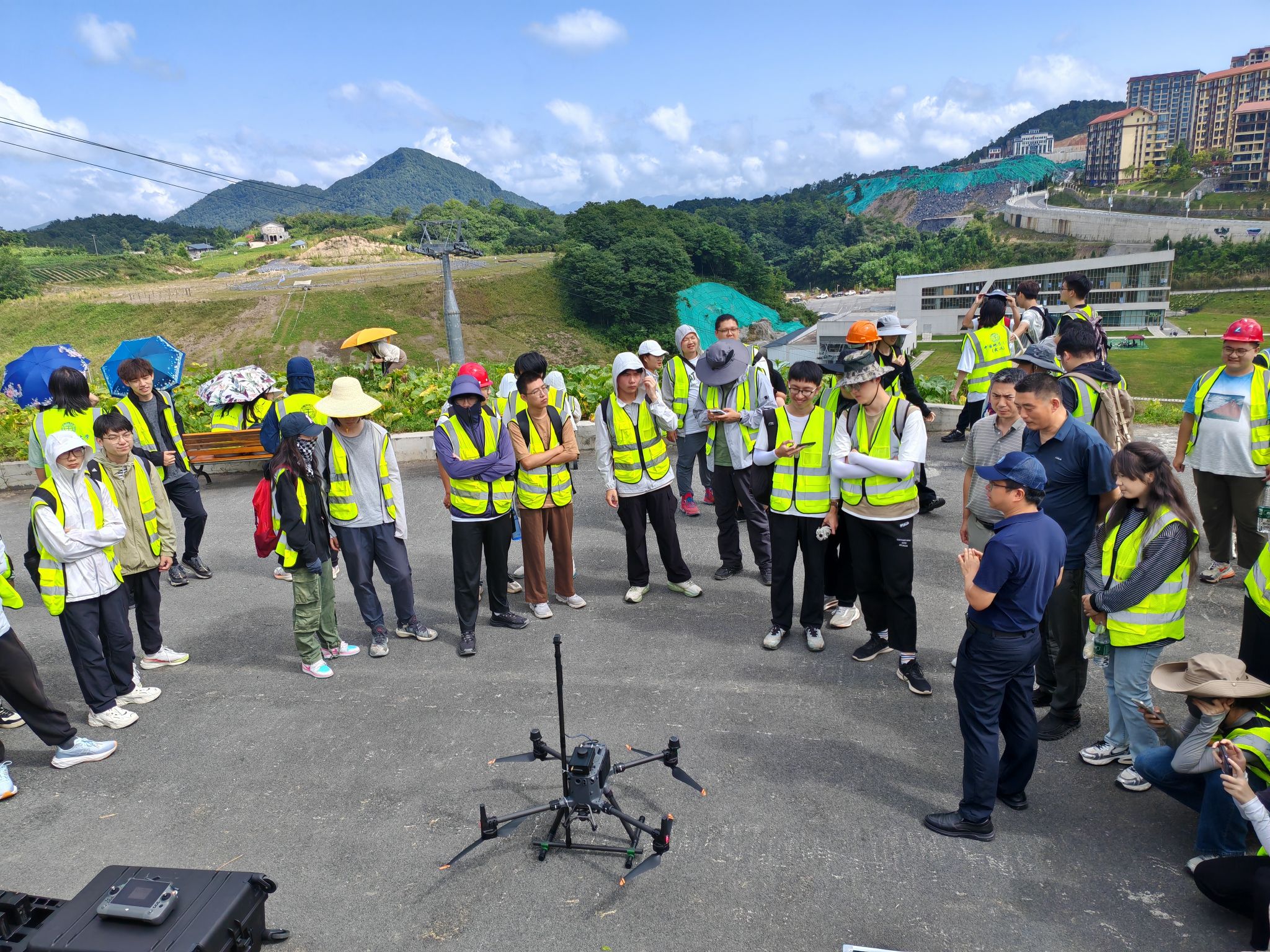 7月26日,马彦周、黄金波跟随实习队师生前往绿葱坡工区进行无人机航磁试验,实地了解实习队野外实习情况。在野外实习现场,磁法组组长刘双老师向两位领导汇报了磁法实习的进展和完成情况,介绍了学院无人机航磁平台的设备购置情况,讲解了无人机航磁的优势,广泛应用于地质调查、矿产资源探测、工程勘察等领域,着力培养学生实践能力。