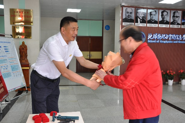 10月10日上午,“庆祝中国地质大学物探65级同学入学60周年大会”在地空学院222报告厅举行。会前学校党委副书记王甫代表学校来到物探楼前亲切看望聚会老校友及他们的家属。学院为每位老校友和家属送上一束鲜花,表达学院师生对为国家地球物理勘探事业发展做出贡献的老校友的崇敬。大会由65级校友何定一主持。