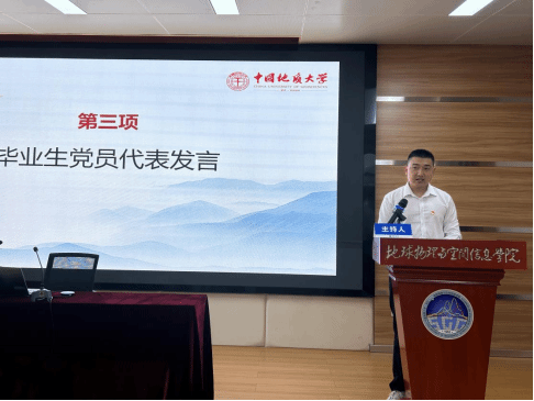城市地球物理学专业本研联合党支部的王世鹏同志作为毕业生党员代表发言,他回顾了在校期间的收获感悟,表达了对党组织关怀的感激。面向未来,他号召同学们要时刻牢记党员身份,坚守廉洁底线,发扬务实作风,立足岗位建功立业。
